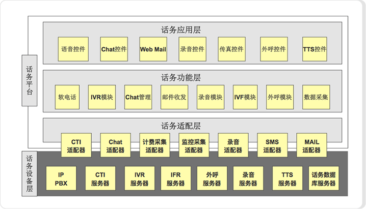 晶宇科技呼叫中心系统,具有自主知识产权,系统主要是由电话语音平台、CTI(计算机电信集成)、IVR(交互式语音系统)、ACD(自动呼叫分配)、数据库(应用数据库服务器,如SQL Server 或MySQL)、座席话机、座席客户端程序等组成。它以电话服务为主要服务方式,结合计算机信息系统的资料数据,为客户提供全方位的服务,包括信息查询、信息咨询、业务受理、售后服务、投诉和建议、申告预约、市场调查、市场营销等功能。它将企业内分属各职能部门为客户提供的服务,集中在一个统一的对外联系“窗口”,采用统一的标准服务界面,为用户提供系统化、智能化、个性化、人性化的服务。